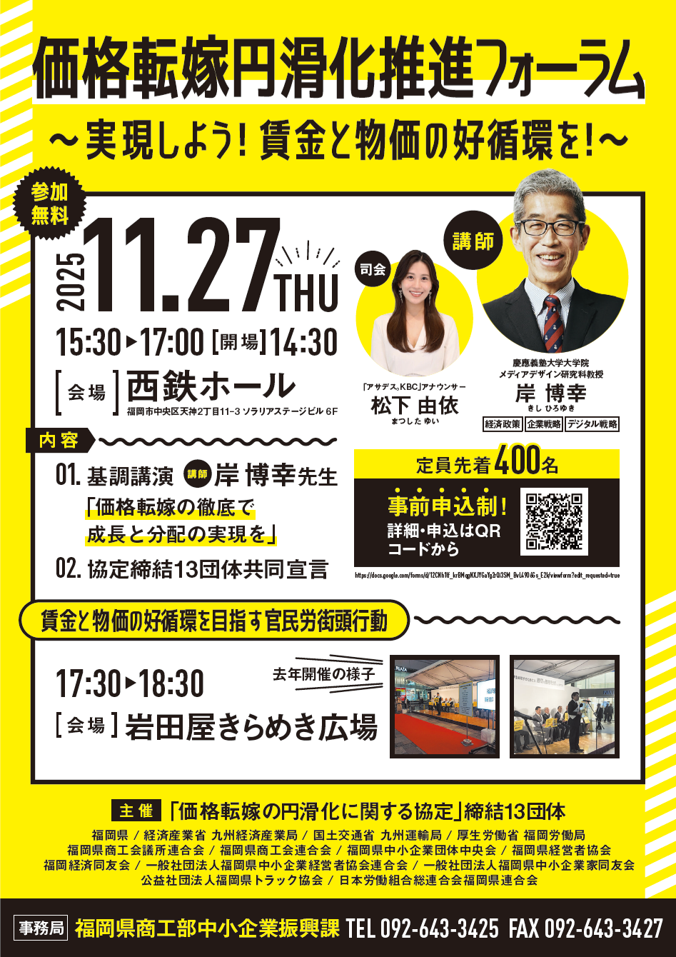 ・日 時:令和7年11月27日(木)15時30分~17時00分 ・場 所:西鉄ホール(福岡市天神 ソラリア6階) ・内 容:基調講演(講師:岸 博幸 氏) 協定締結13団体による共同宣言など ・定 員:先着400名